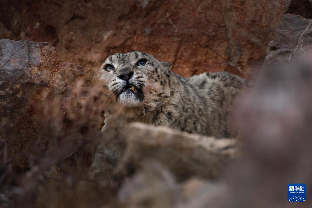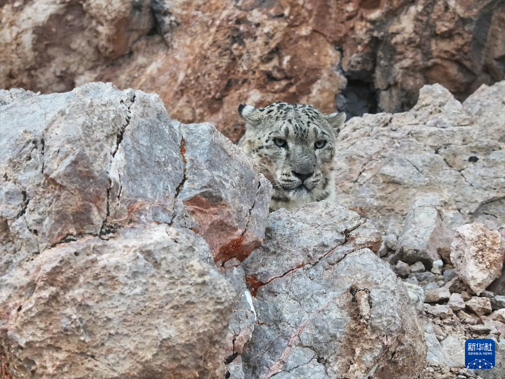 西藏阿里改则县改则镇玉多村附近岩山区域拍摄到的国家一级保护动物雪豹(4月18日摄)。新华社发(索朗仁青 摄)