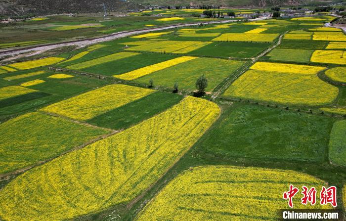 7月5日,西藏拉萨市墨竹工卡县油菜花盛放。无人机航拍视角下,一块块金黄的油菜花田犹如大地的调色板,风光宜人。(无人机照片)中新社记者 李林 摄