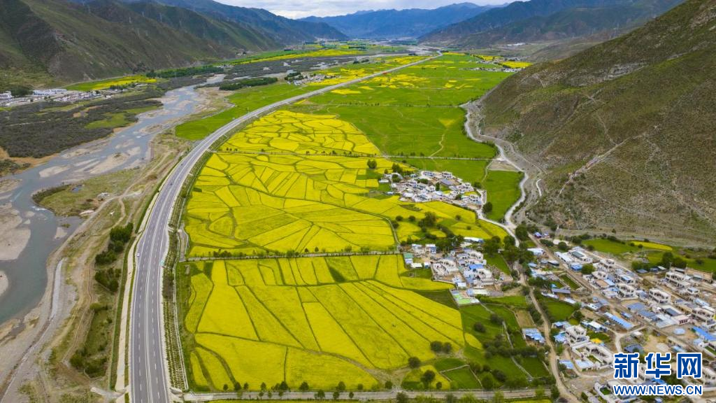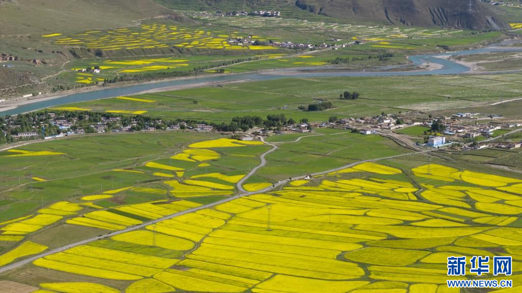 图为7月2日拍摄的墨竹工卡县唐加乡卓尼村油菜花田景色(无人机照片)。新华网发 洛克 摄