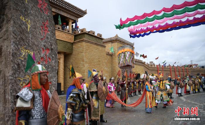 2019年9月16日,四川甘孜县格萨尔王城暨百村产业基地举行开城仪式,城内以格萨尔故事打造的景观小品体验地有1000余处,游客可听《格萨尔》说唱、看《格萨尔》藏戏等。中新社记者 刘忠俊 摄