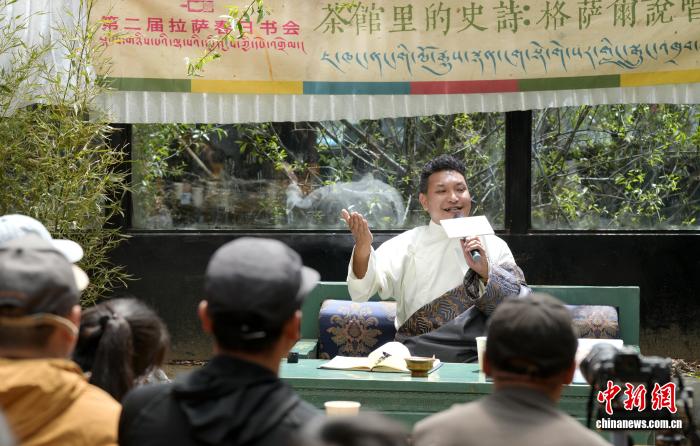 2025年4月20日,格萨尔说唱艺人斯塔多吉在拉萨甜茶馆里演绎格萨尔说唱。中新社记者 李林 摄