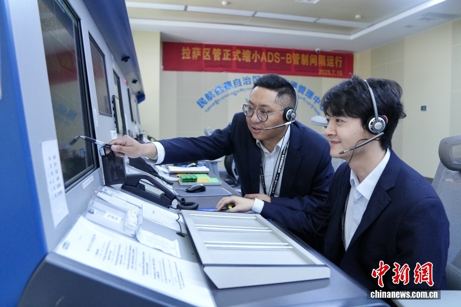 2025年是西藏自治区成立60周年,也是西藏民航通航60周年。在民航空管领域,管制员肩负指挥飞机运行、保障飞行安全等重要职责,具体分为区域管制员、塔台管制员等角色。在位于拉萨贡嘎国际机场的民航西藏空管中心,59名汉族和18名藏族管制员通力合作,以“老带新”“传帮带”,在守护蓝天的岗位上谱写了汉藏一家亲的故事。图为7月22日,区域管制员强旦(左,藏族)指导见习管制员王轩(右)发布指令。西藏地处高原地区,气象复杂多变,对区域管制员的综合协调应对能力要求高,见习管制员的能力提升离不开师傅的殷切指导。中新社记者 张祥毅 摄