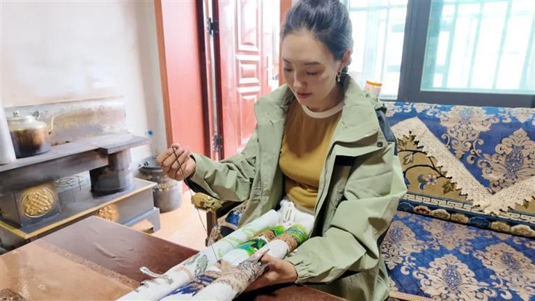 卓玛措姆在绣十字绣。 图由洛桑旺久提供