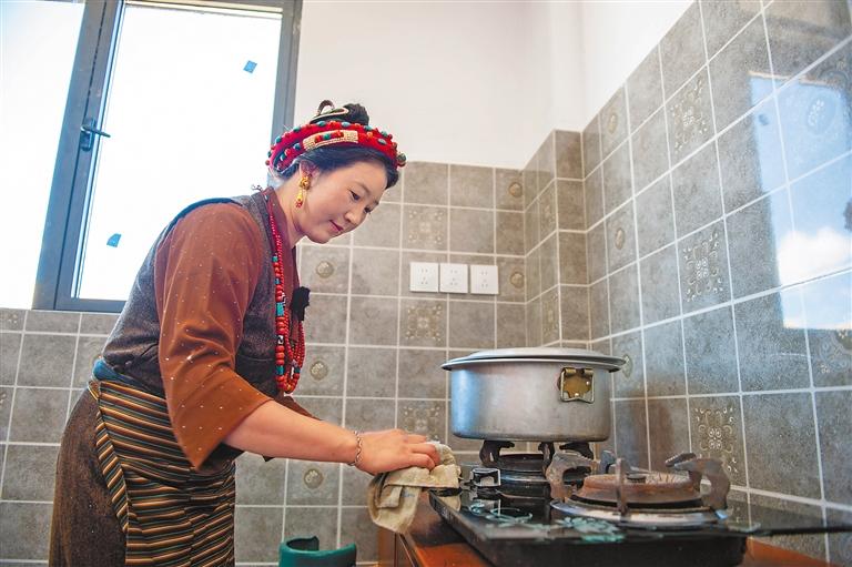 定结县乃村村民在新房内收拾厨房。记者 旦增嘎瓦 摄