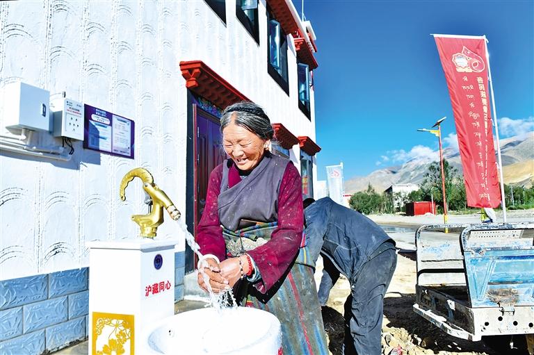 定日县森嘎村首批入住村民在家门口用上了自来水。记者 王敏 摄