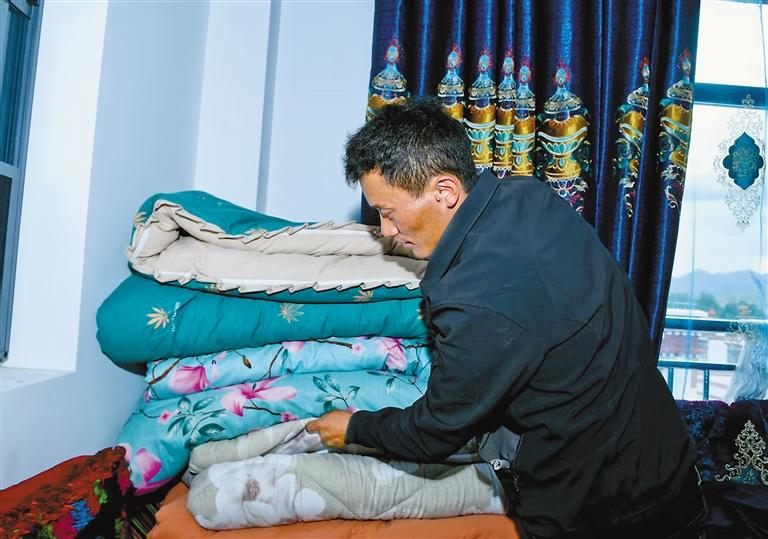 定日县森嘎村首批入住村民在新家整理被子。记者王敏 摄