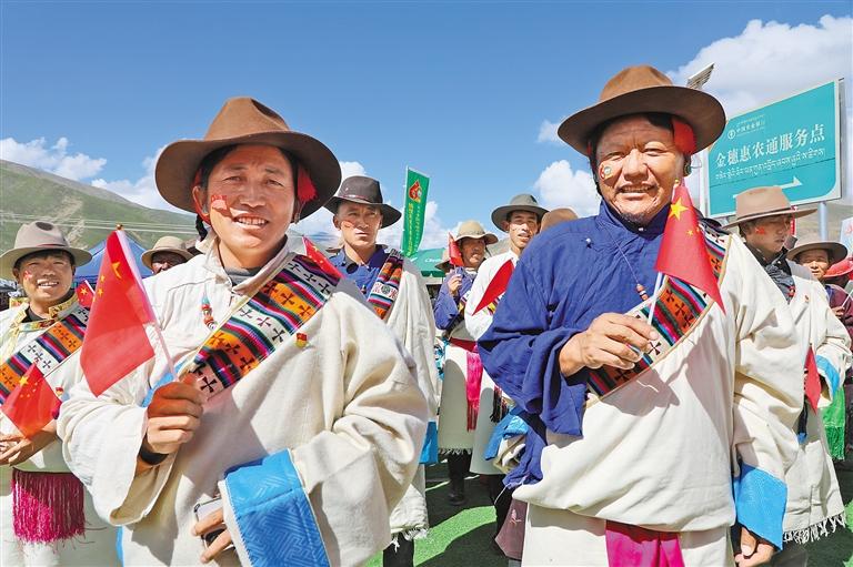 仪式结束后,当地党员干部、建设者和群众围在一起,用欢快的锅庄舞出“同心圆”。现场还开展了贴福字、健康义诊等志愿服务活动。