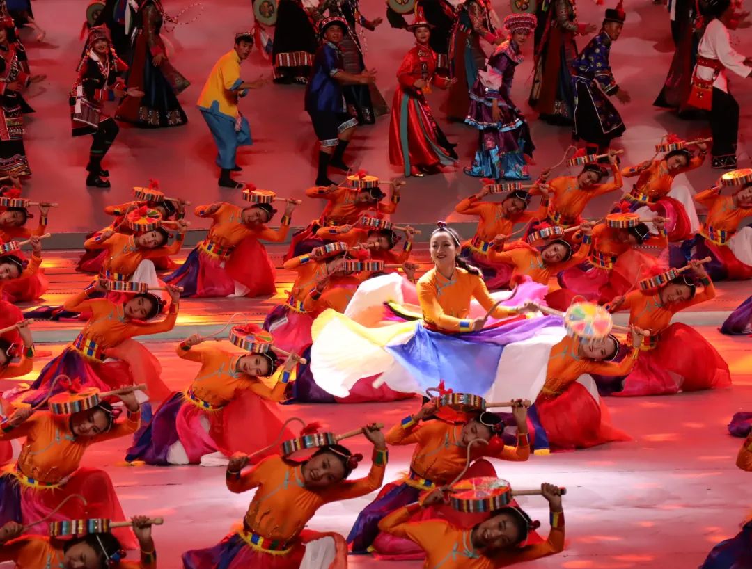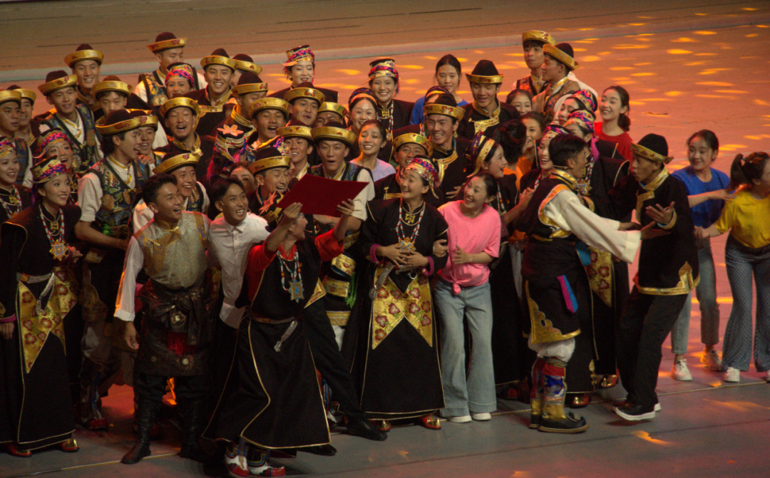 晚会接近尾声时,《同心共舞新时代》的旋律响起——56个民族的演员身着各民族盛装,手拉手、心连心在舞台上起舞,将现场气氛推向最高潮。在红涛眼中,这个节目正是整台晚会的精神落脚点:“团结、感恩、奋进,这三个词贯穿了《雪域欢歌》的始终。”