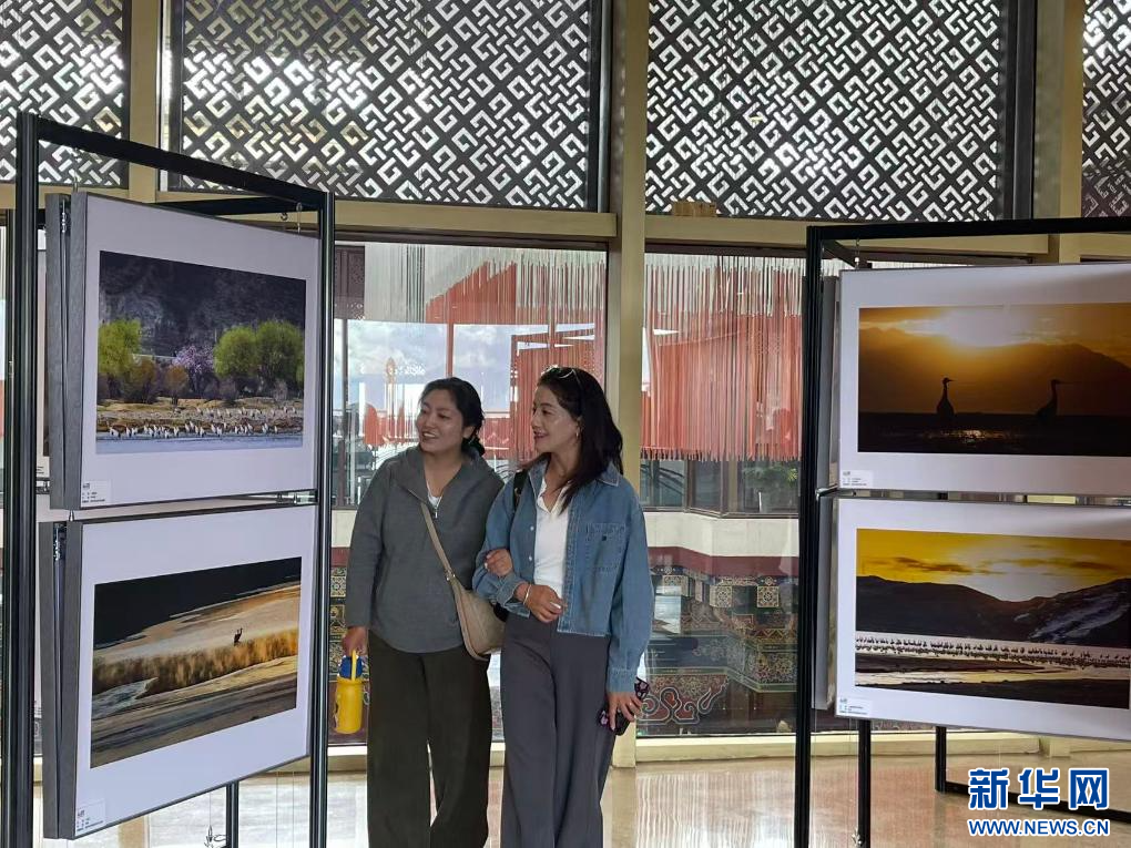 拉萨市民群宗(右一)和朋友在观看“天上西藏·鹤鹤有鸣”——黑颈鹤主题摄影展作品。新华社记者 蒋梦辰 摄