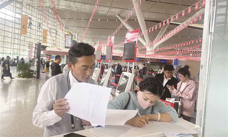 9月14日,万女士按时抵达拉萨贡嘎国际机场祥鹏航空值机柜台。地面服务工作人员认真查看了《动物检疫合格证明》、宠物疫苗注射证明等材料,迅速为万女士办理了相关乘机手续。随后,工作人员全程提供陪同服务,先与机场安检部门积极协调,帮助万女士和宠物高效通过安检;接着引领万女士登机,并与航班客舱经理做好详细交接。