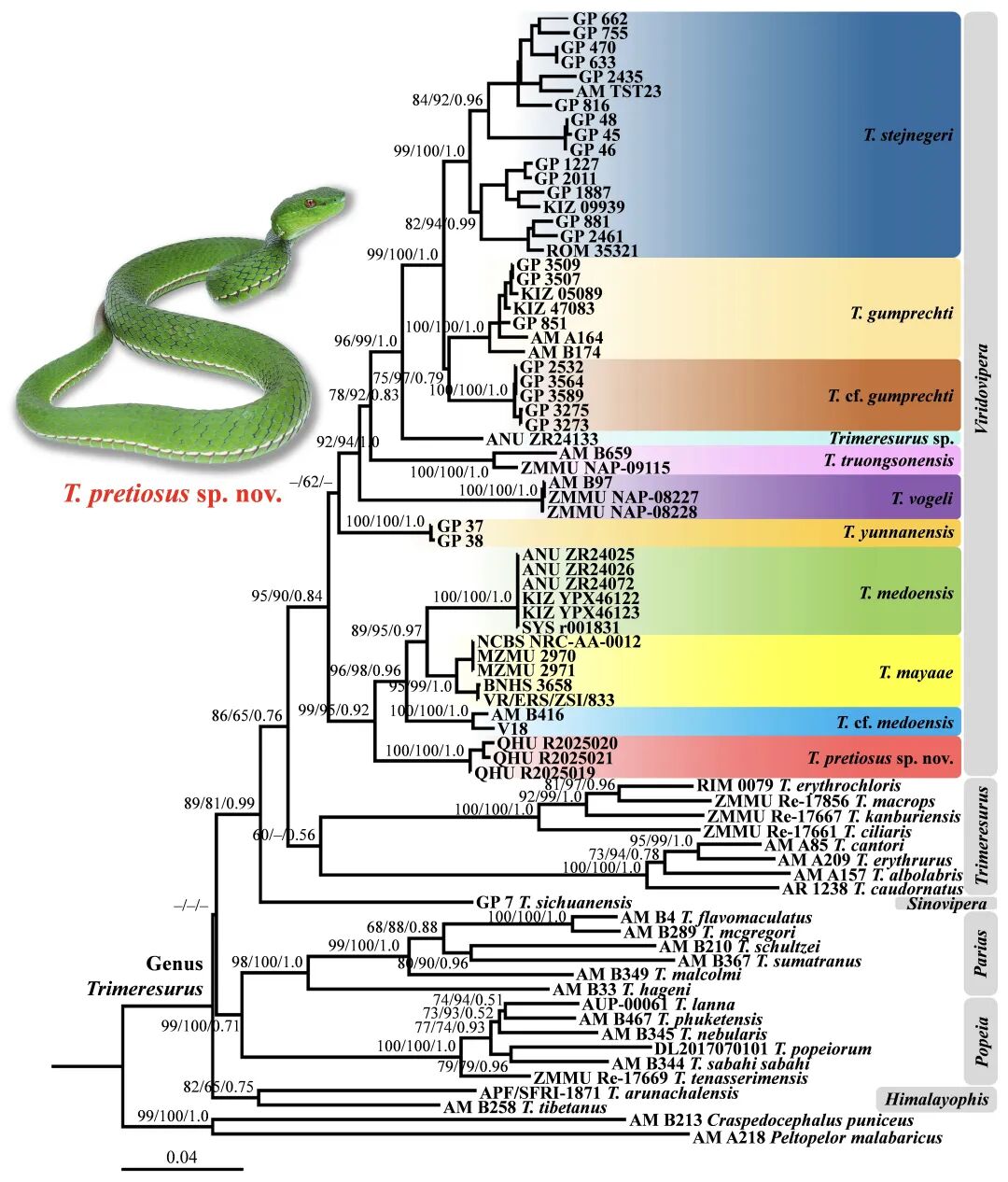 今年6月,依托西藏自治区科技计划项目及“西藏自治区财政工作业务经费—西藏生物种质资源采集与保存(2025年度)”等资助,该科研团队在亚东县开展两栖爬行动物资源调查和种质采集时,于下亚东乡海拔约1824米的湿润阔叶林区域,首次发现该物种。通过分子生物学与形态学综合分析,团队确认该物种在鳞片特征、体色模式等关键形态特征及遗传距离上与已知竹叶青属物种存在显著差异,其遗传差异亦达到新物种界定标准,从而将其确立为一个独立的新物种。