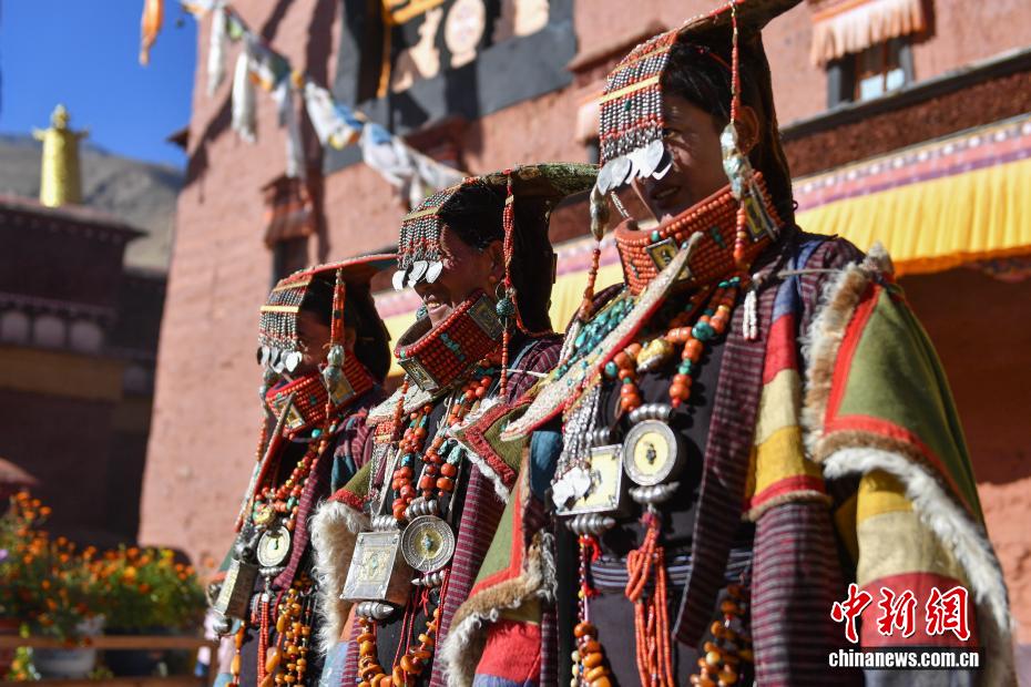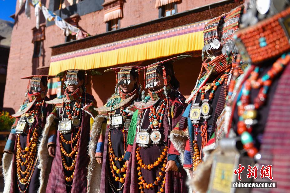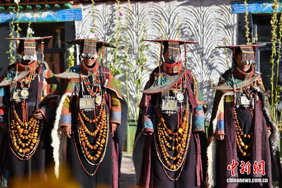 9月23日,西藏自治区阿里地区普兰县,至今保留着独特的藏族服饰——普兰服饰,它是中国国家级非物质文化遗产。普兰服饰已有1000多年的历史,其中最精美、最独特的是妇女的“孔雀服饰”,普兰县科迦村里有7户人家保存着7套祖传服饰,一套重达20多公斤,装饰有黄金、白银、松石、玛瑙、珊瑚、珍珠等,承载和沉淀了百年时光,堪称“穿在身上的千年史”。时至今日,这种美丽的服饰文化还在当地传承着。图为西藏阿里地区普兰县科迦村,村民在展示普兰服饰。贡确 摄