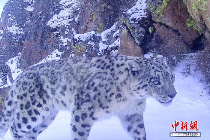 2025年4月13日,西藏拉萨乃朗谷雪豹重要栖息地记录到雪豹“拉姆”“带娃”现身于红外相机前。(乃朗生态文化保护中心供图)