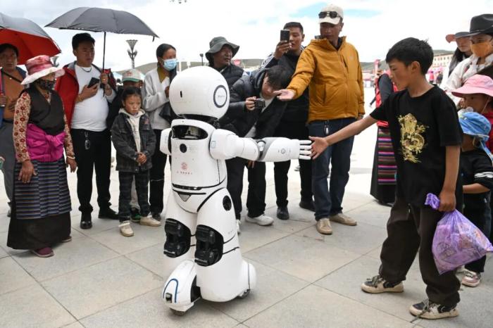 2025年9月6日,在西藏那曲市恰青赛马节现场,机器人的惊喜亮相,吸引前来观赛的民众与其互动。中新社记者 贡嘎来松 摄