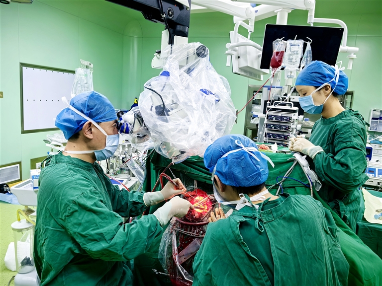手术当日,在麻醉科和手术室护士团队的密切配合下,由郝强主刀,单永炳、付永鹏担任助手,为患者实施了手术。术中,郝强在显微镜下仔细分离肿瘤周边的重要血管,最大程度保护周边脑组织不受损伤,如同在生命禁区里仔细操作。术中一次性完整切除位于不同脑叶的3枚肿瘤,由于脑膜上散在多枚微小脑膜瘤,遂将侵犯脑膜一同切除。手术过程顺利,患者恢复良好。术后复查头颅MRI显示,颅内肿瘤已完全消失,无残留。目前患者积极康复治疗,将择期出院。