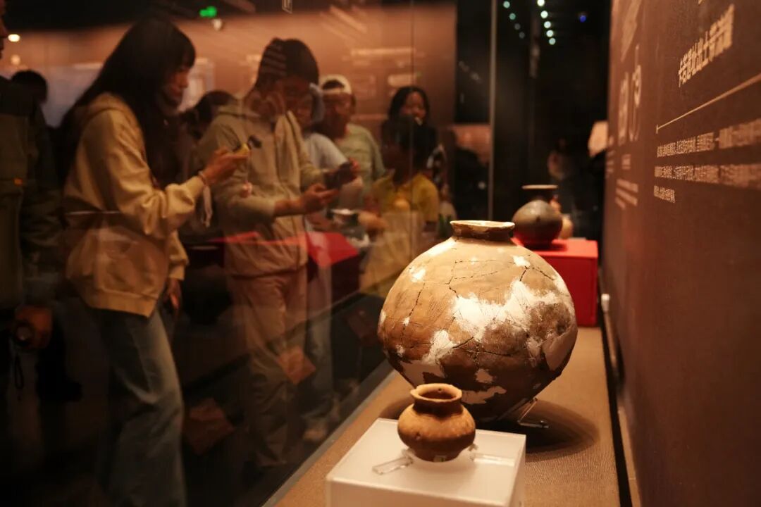 2025年7月15日,在位于拉萨的西藏博物馆,卡若遗址出土的陶器吸引观众。中新社记者 张祥毅 摄