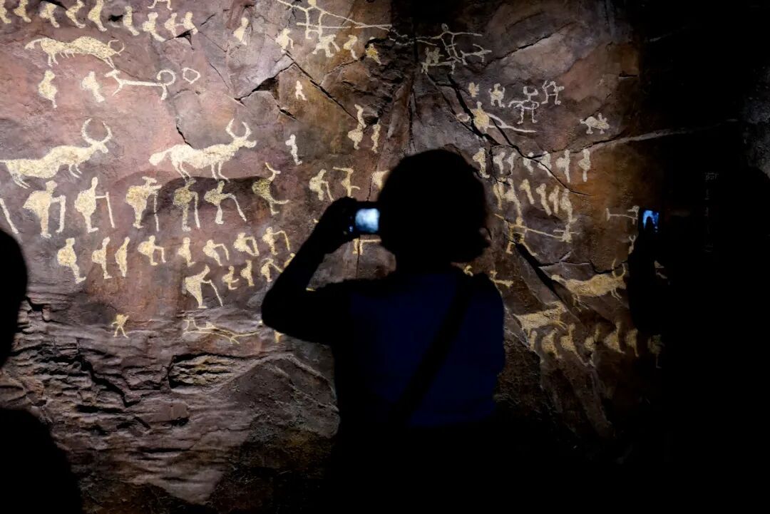 2024年10月19日,西藏拉萨,参观者在西藏博物馆内拍摄岩画。中新社记者 李林 摄