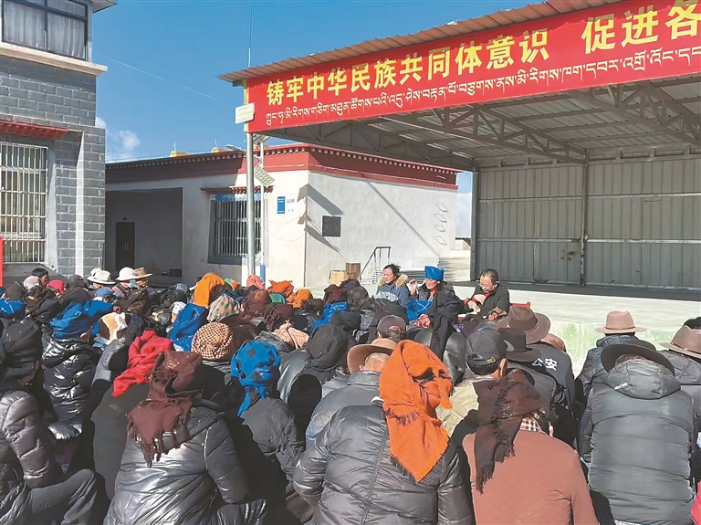 图为央金(前排中)向村民宣讲如何铸牢中华民族共同体意识。林周融媒提供