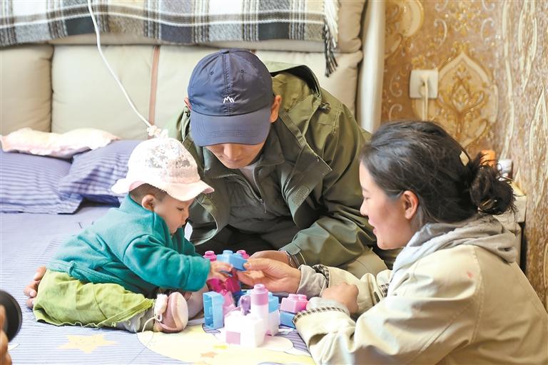 哲古镇哲古社区居民白玛顿珠和妻子在温暖的卧室里陪儿子做游戏。措美县委宣传部供图