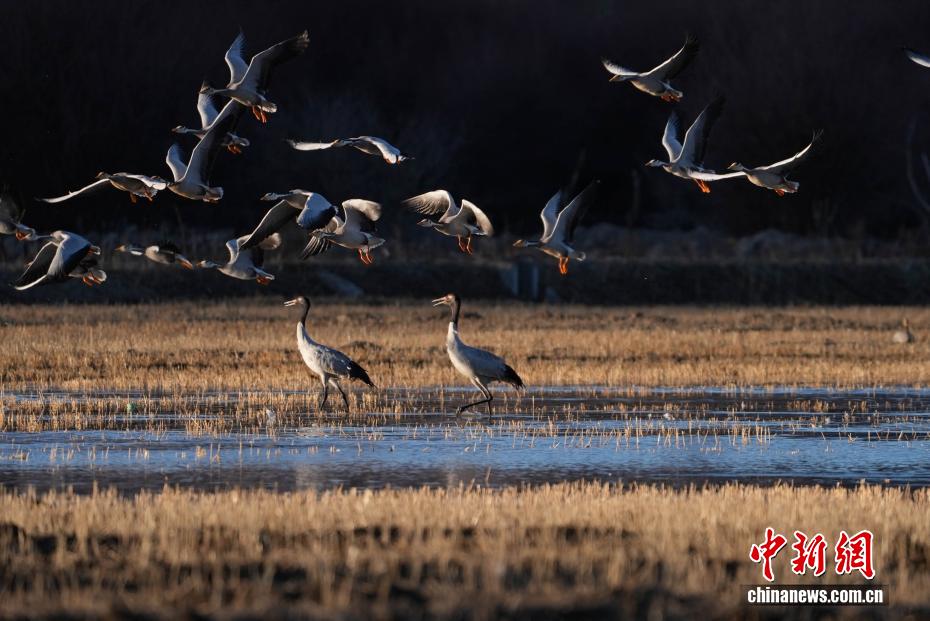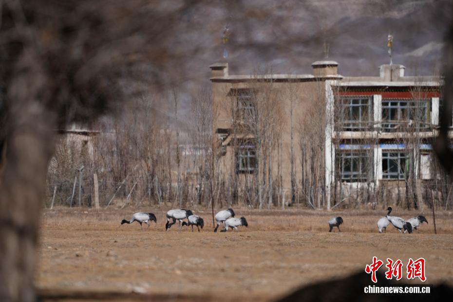 11月26日,位于西藏自治区拉萨市林周县黑颈鹤自然保护区内,大批越冬黑颈鹤现身卡孜水库及田间地头,悠闲觅食、嬉戏。这些远道而来的黑颈鹤,将在此栖息至次年三四月份。黑颈鹤为中国国家一级保护动物,也是唯一在高原生活、繁殖的鹤类。近年来,随着当地生态保护力度持续加大,前往林周县越冬的黑颈鹤等候鸟数量逐年增多。图为黑颈鹤在林周县境内的农田里觅食、嬉戏。贡确 摄