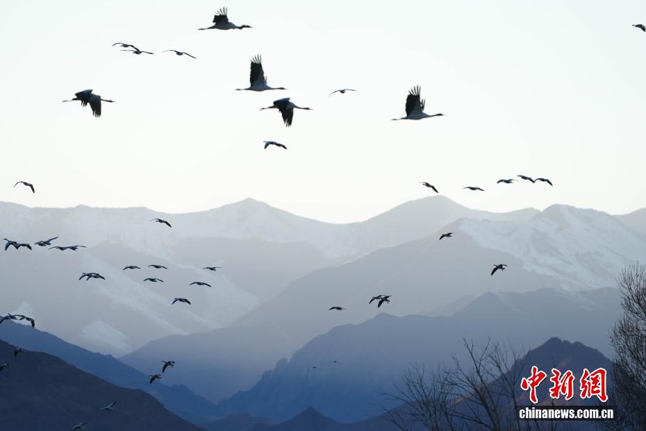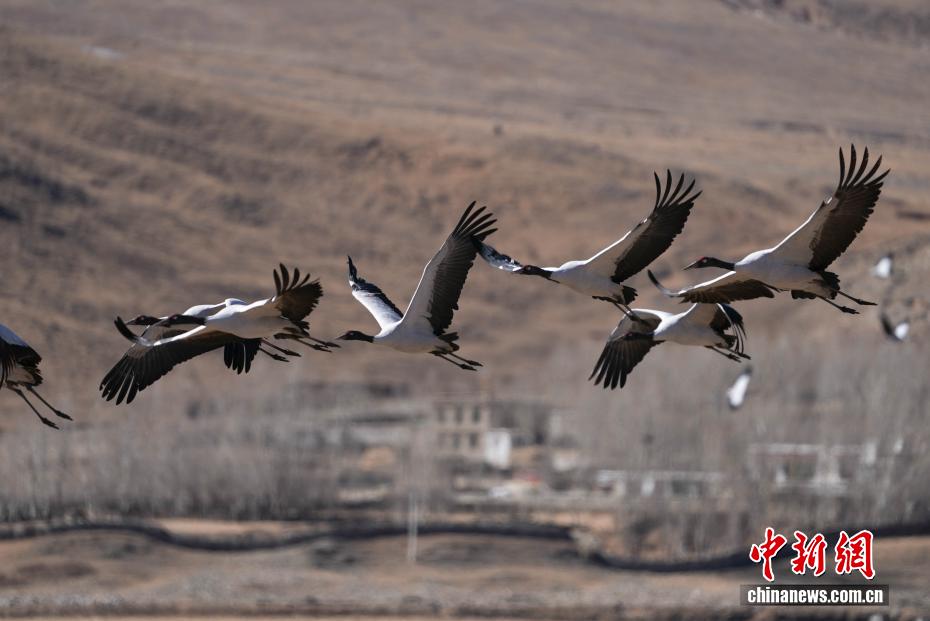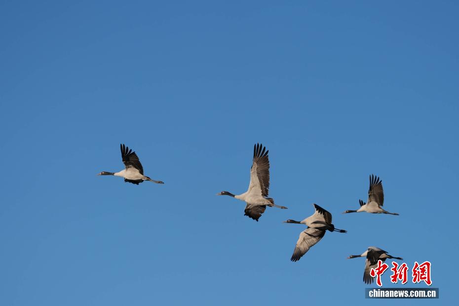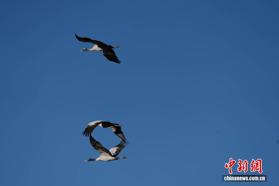 11月26日,位于西藏自治区拉萨市林周县黑颈鹤自然保护区内,大批越冬黑颈鹤现身卡孜水库及田间地头,悠闲觅食、嬉戏。这些远道而来的黑颈鹤,将在此栖息至次年三四月份。黑颈鹤为中国国家一级保护动物,也是唯一在高原生活、繁殖的鹤类。近年来,随着当地生态保护力度持续加大,前往林周县越冬的黑颈鹤等候鸟数量逐年增多。图为黑颈鹤在林周县黑颈鹤保护区内飞翔。贡确 摄