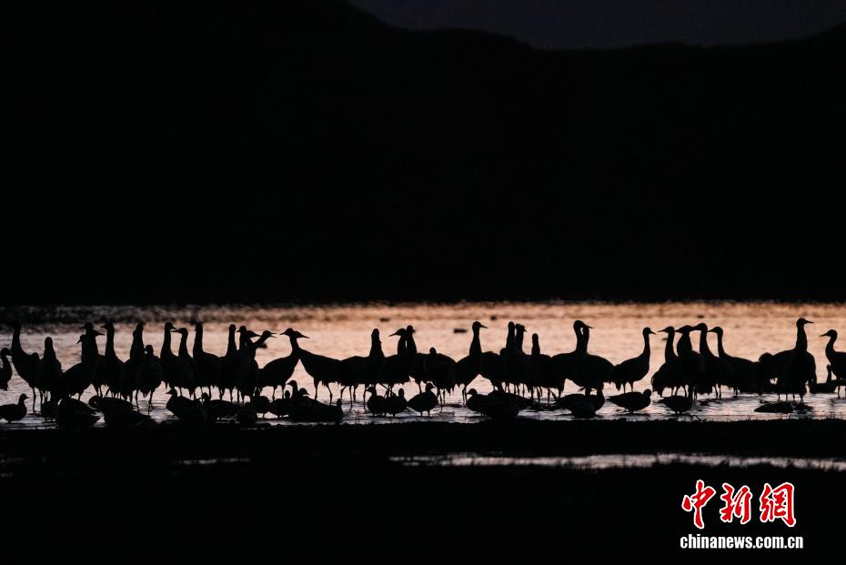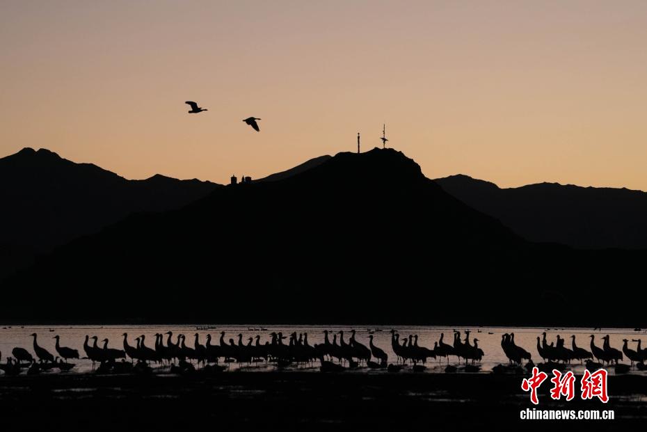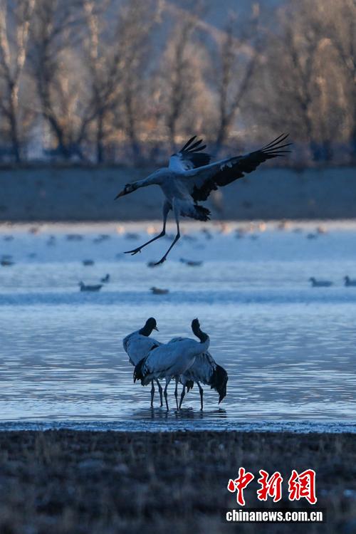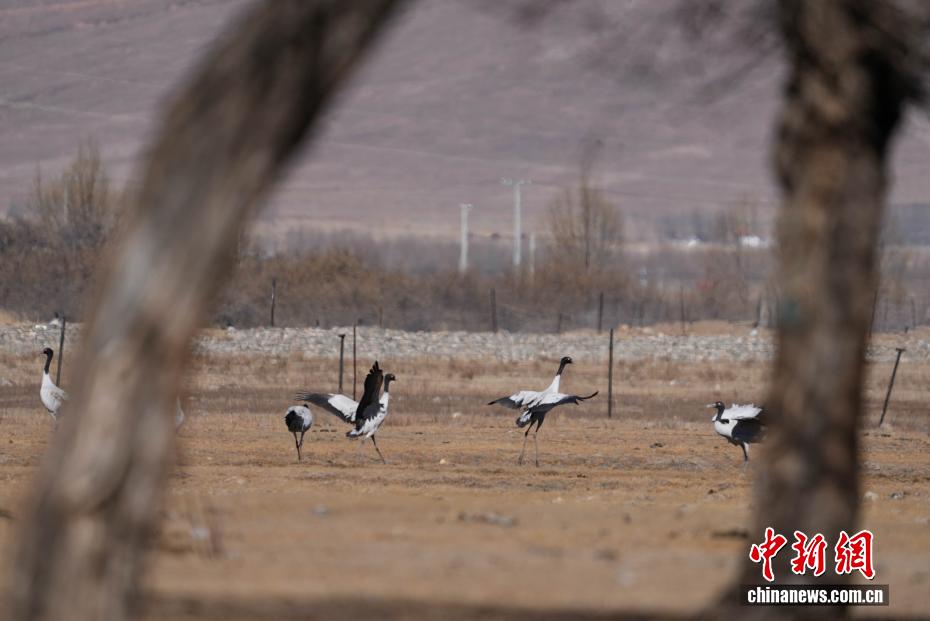 11月26日,位于西藏自治区拉萨市林周县黑颈鹤自然保护区内,大批越冬黑颈鹤现身卡孜水库及田间地头,悠闲觅食、嬉戏。这些远道而来的黑颈鹤,将在此栖息至次年三四月份。黑颈鹤为中国国家一级保护动物,也是唯一在高原生活、繁殖的鹤类。近年来,随着当地生态保护力度持续加大,前往林周县越冬的黑颈鹤等候鸟数量逐年增多。图为在林周县卡孜水库拍摄的黑颈鹤。贡确 摄