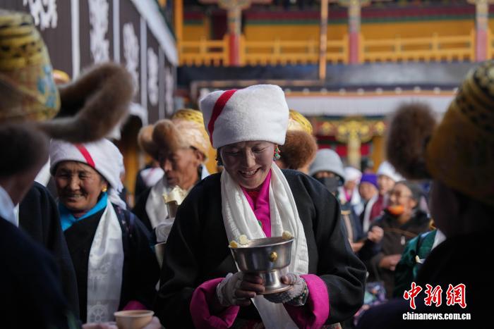 11月28日,随着藏历十月十五白拉姆节临近,连日来,拉萨及周边信众身着色彩艳丽的藏装节日盛装,手持从家中精心准备的头等青稞酒、新收的青稞及新鲜水果,陆续前往大昭寺、色拉寺、哲蚌寺等寺庙朝拜祈福。大昭寺内,信众敬献供品后载歌载舞,歌声悠扬、舞步轻快,尽显节日喜悦。白拉姆节又称 “仙女节”。相传,白拉姆是拉萨地区的保护神,是藏传佛教最高护法神之一班丹拉姆的女儿。白拉姆曾与大昭寺护法神赤尊赞相互爱慕并私定终身,其母亲班丹拉姆发现后,赤尊赞被赶到拉萨河南岸,每逢藏历十月十五日,二人才能隔河相见一次。图为白拉姆节临近之际,信众在大昭寺内敬献供品后载歌载舞的场景。贡确 摄