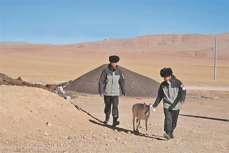 图为雄热管护站管护员及救助的小藏羚羊。记者 万靖 摄
