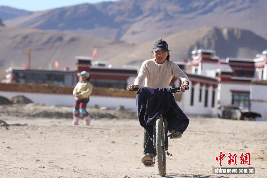 2025年1月7日,西藏定日发生6.8级地震,时隔近一年,12月24日,中新社记者探访灾后重建。日喀则森嘎村的藏式新房错落有致,柏油路连通家家户户,屋顶太阳能热水器整齐排列,炊烟袅袅间满是生机。据悉,此次日喀则地震灾后重建覆盖7县47乡镇486村,2.2万余户重建民房、1.05万余户维修加固民房已全部竣工交付,受灾民众喜迁新居。图为森嘎村的一个女孩在自家新房前骑自行车。中新社记者 贡嘎来松 摄