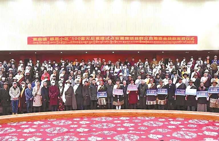 图为西藏银行为夏曲镇受灾群众发放贷款,帮助群众重建家园。