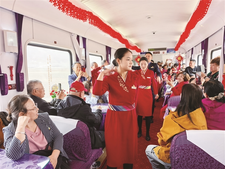 针对高原旅游特殊性及“银发族”为主的客群特点,中国铁路青藏集团有限公司持续升级服务保障体系,让旅途兼具安全性与舒适度。车辆方面,该公司完成适老化与舒适化改造,打造2组普惠型旅游专用车组,入藏专列均采用全列有氧卧铺车厢,配备弥散式供氧系统、专用发电车及精品餐车,有效缓解旅客高原反应。服务方面,该公司组建“导游+乘务+医护”三位一体复合型服务团队,全程提供健康监测、文化讲解、应急保障等全流程陪伴服务;车厢内以民族纹饰、剪纸窗花营造地域氛围,文艺小分队沿途献上藏族歌曲、舞蹈等特色表演,餐车则供应烤羊腿、牦牛酸奶、特色奶茶等地方风味美食,让旅程更加舒适美好。运营模式上,该公司采用“晚上开行、白天游玩、边走边停”的设计,途经玉珠峰、沱沱河、羌塘草原等高原奇景,在海拔5072米的唐古拉站、措那湖等标志性地点定点停靠,让游客在休息中跨越山海,充分领略雪域风光。同时,该公司强化公铁联运与景区接驳,推出“旅游小管家”一站式服务,确保游客“行得顺畅、吃得地道、玩得尽兴”。
