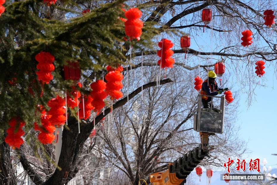 2月3日,西藏拉萨,工人正在挂灯笼。随着春节、藏历新年的临近,拉萨城区大街小巷被精心装点,年味愈发浓郁。中新社记者 李林 摄