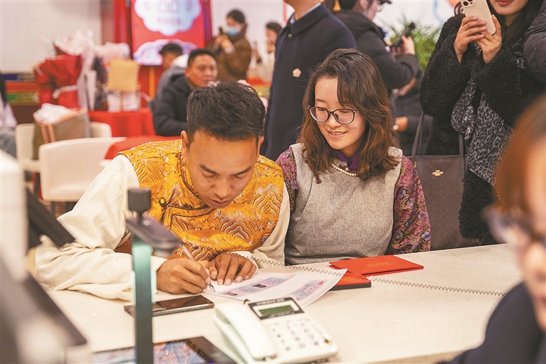 2月14日情人节不仅是情侣们倾诉爱意的特殊时刻,也是许多人心中办理婚姻登记的绝佳日子。当天上午10时,拉萨市三级政务服务大厅婚姻登记处热闹非凡,一对对满怀憧憬的情侣早早赶来,只为在这个浪漫的日子里,定格属于彼此的幸福瞬间。