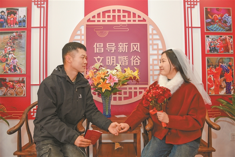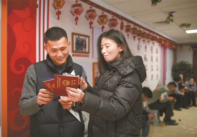 图为新人拍摄结婚证分享喜悦。记者 潘多 摄