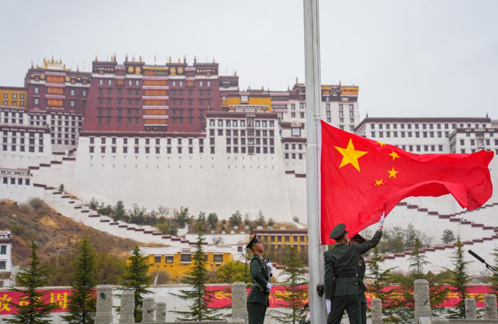 3月28日,布达拉宫广场举行升国旗仪式,隆重纪念西藏百万农奴解放67周年。新华社记者 丁增尼达 摄