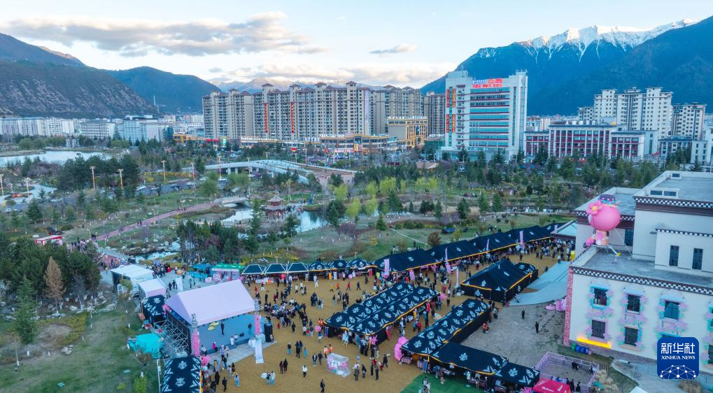 这是4月3日拍摄的林芝第二十三届桃花旅游文化节“堆春行动”集市现场(无人机照片)。新华社记者 丁增尼达 摄
