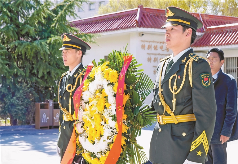 西藏职业技术学院国旗护卫队队员为谭冠三将军墓敬献花篮。记者 索朗旺久 摄