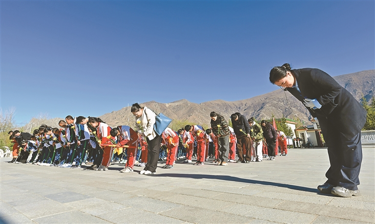 拉萨市中小学生代表在拉萨烈士陵园革命烈士纪念碑前鞠躬致敬。记者 唐斌 白玛泽旺 摄
