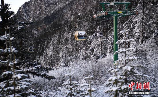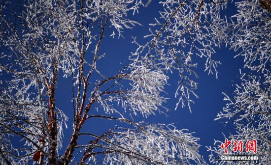 1月31日,四川泸定县磨西镇,一场大雪后的海螺沟迎来冬日暖阳,原始森林、千年冰川让游客流连忘返。图为海螺沟景区雾凇美景。中新社记者 刘忠俊 摄