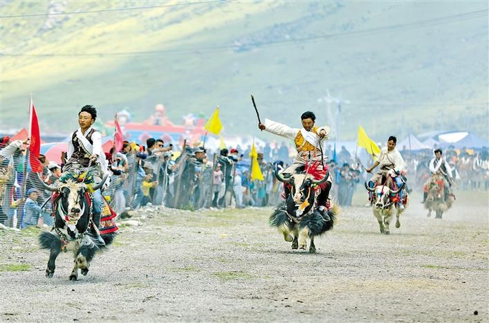 近日,西藏拉萨市墨竹工卡县扎西岗乡斯布村村民身着节日盛装,开展赛牦牛活动,在载歌载舞中欢度雪顿节和望果节。图为村民在进行传统赛牦牛比赛。洛桑克珠 唐斌 摄