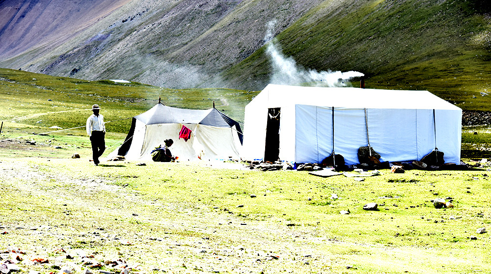 正聊着,次供的大儿子丹增多吉掀开帐篷帘子,走了出来。他的手里提着白菜,打算去旁边的溪水边清洗。“靠右边的溪水比较干净,平时用水也是在这儿打。左边的溪水,遇上下雨就特别浑浊。”