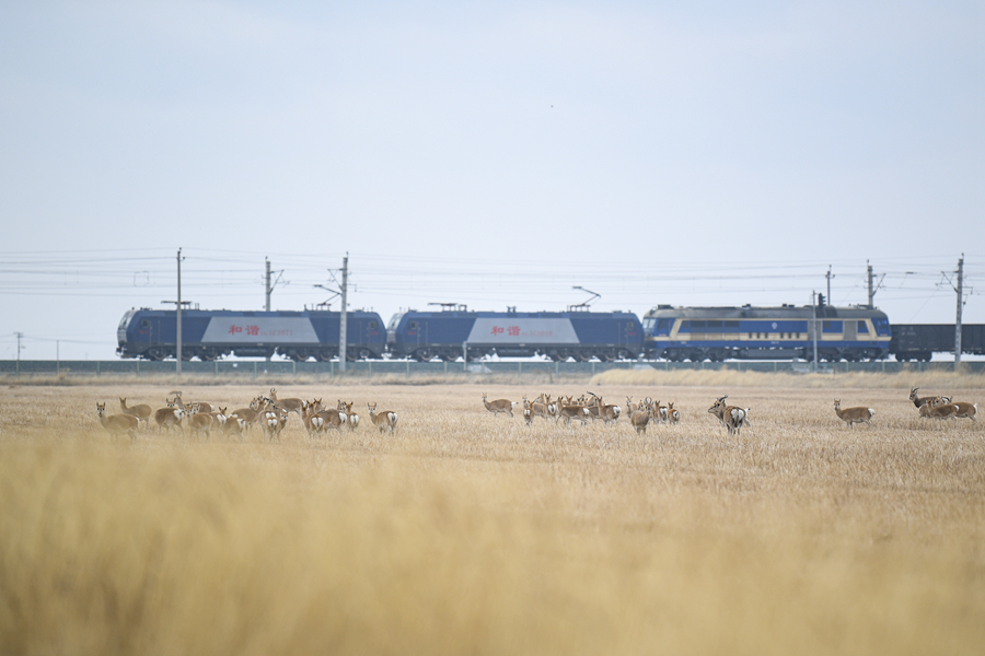 一群普氏原羚通过道路时谨慎观望。(11月20日摄)新华网 潘彬彬摄