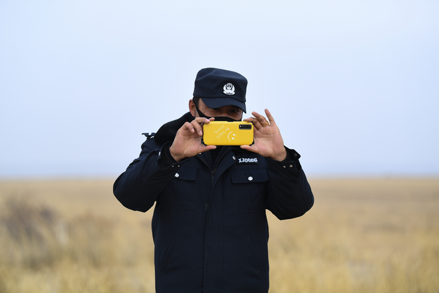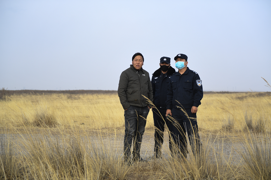 11月20日,刚察县森林公安局哈尔盖派出所民警秦辉武(右一)和辅警东知布在特护区内进行日常巡护。新华网 潘彬彬摄