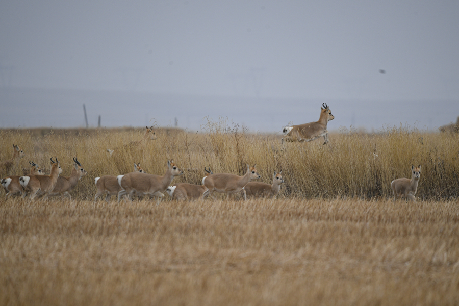 11月20日,一群普氏原羚在青海湖普氏原羚特护区内活动。新华网 潘彬彬 摄