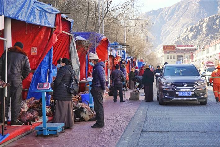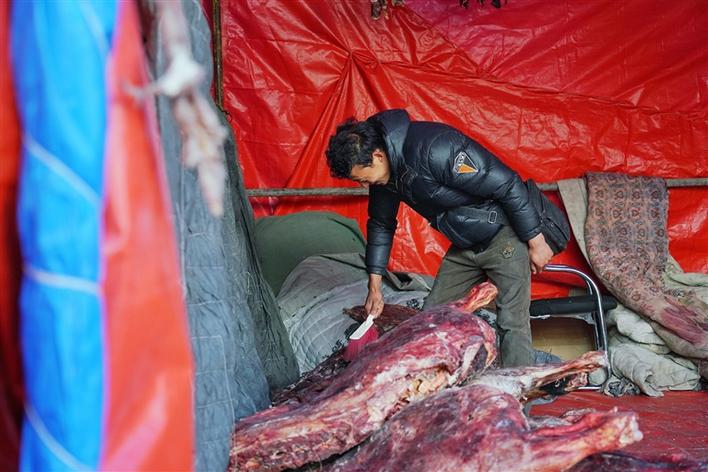 “买肉吗?我家的牦牛肉肉质鲜美、价格公道。”扎西笑着说。他来自拉萨市当雄县宁中乡,早在去年11月中旬就和朋友一起从老家来到拉萨市区内售卖牦牛肉。