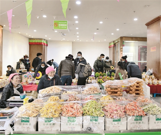 在宗角禄康公园北门至西门这条“卡塞一条街”上,每家卡塞店内,五颜六色的各式卡塞堆成小山,来店里购买的市民络绎不绝。“卡塞”是一种用白面、酥油制成的藏式点心,是藏历新年必备的年货之一。比较常见的卡塞有圆形的“卜鲁”,花瓣形的“梅朵”,还有层层叠加的“桑噶巴列”,为了更加美观,花瓣形的“梅朵”会被涂上各种颜色。