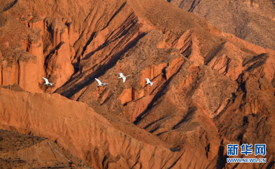 1月22日,大天鹅在青海省贵德县境内飞翔。新华社记者 张宏祥 摄