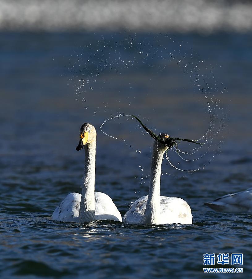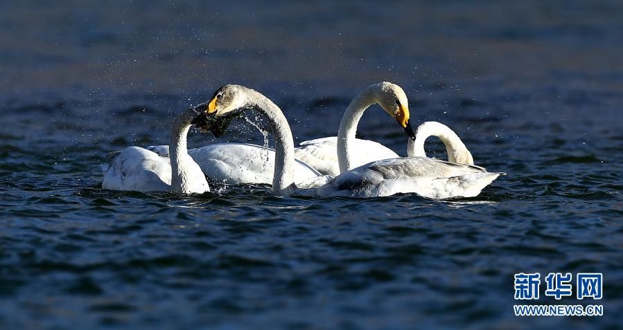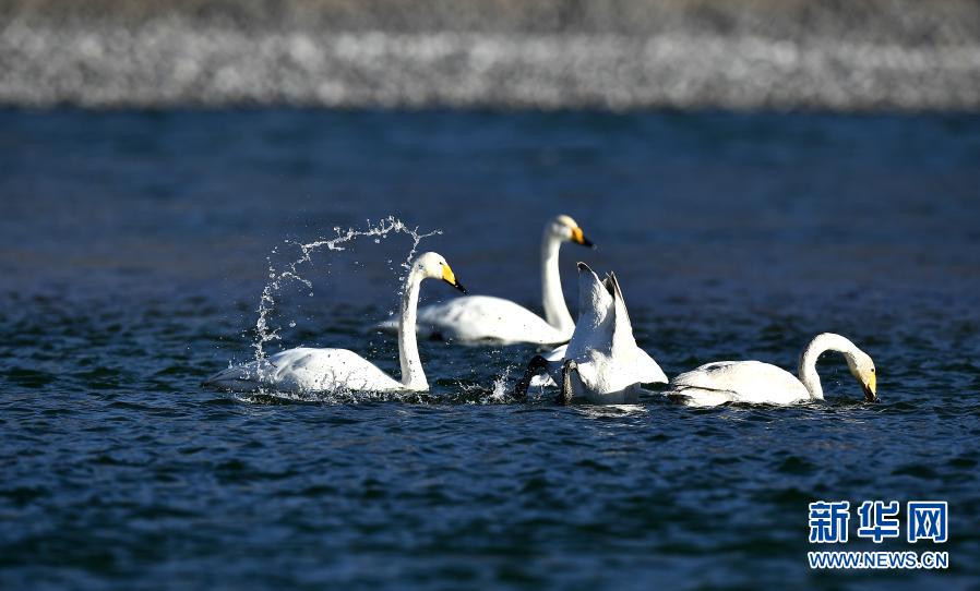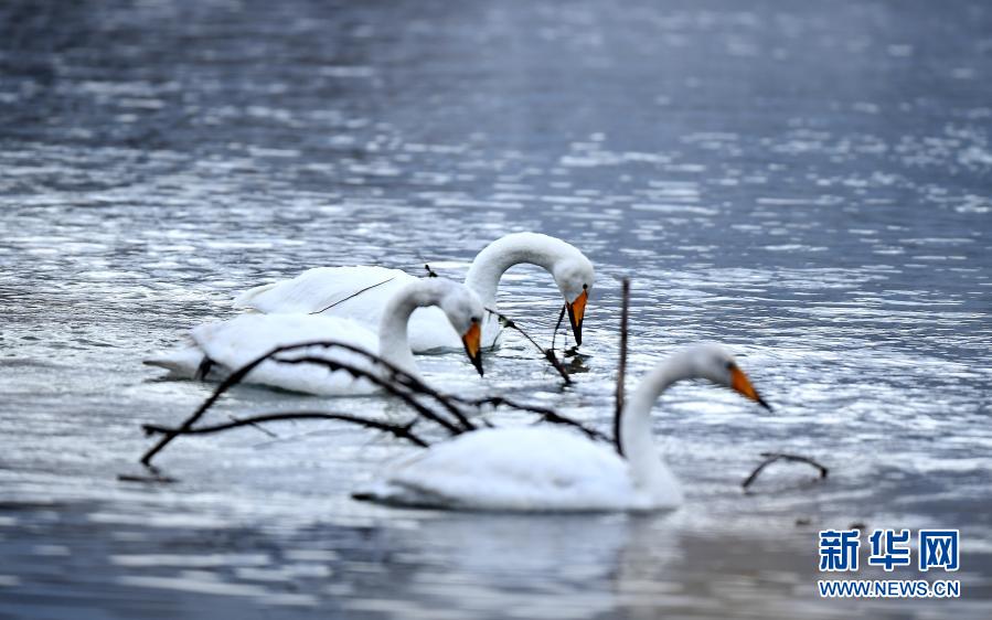 1月22日,大天鹅在青海省贵德县境内的黄河中觅食。新华社记者 张宏祥 摄