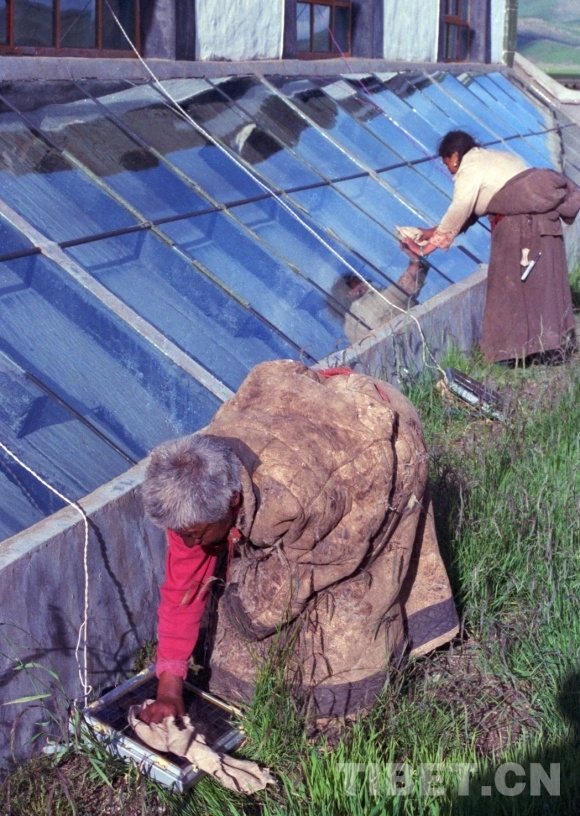 图为藏北那曲县(现改为色尼区)建成的集太阳能采暖、硅光照明、太阳灶做饭的养老院。图为五保户老人正在擦拭采暖房玻璃和硅光电池板 唐召明1988年摄