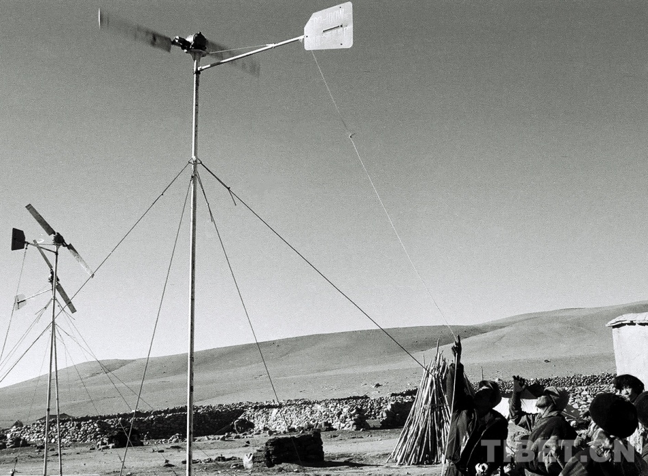 图为那曲风能实验站技术人员为双湖办事处(现改为双湖县)嘎措乡牧民检修保养所安装的风力发电机 唐召明1988年摄